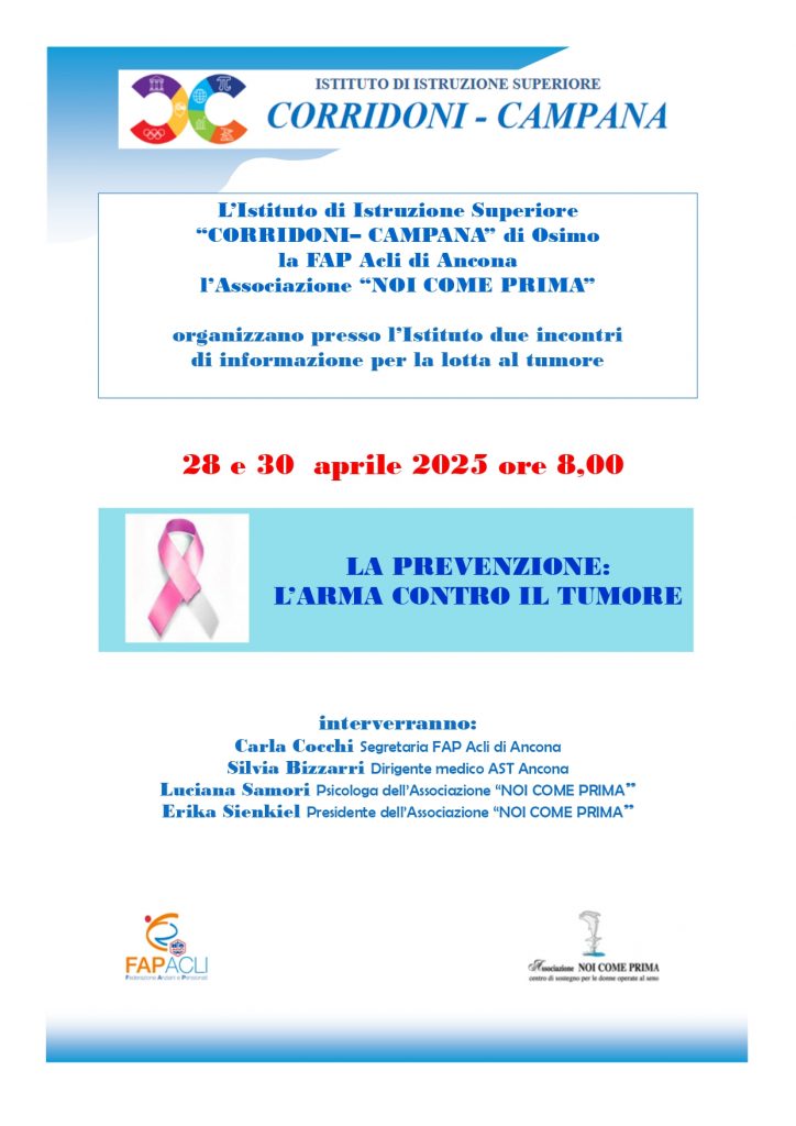 La FAP ACLI di Ancona, in sinergia con l’Associazione “NOI COME PRIMA”, organizza due incontri di informazione per la lotta al tumore presso L’Istituto di Istruzione Superiore “CORRIDONI– CAMPANA” di Osimo.