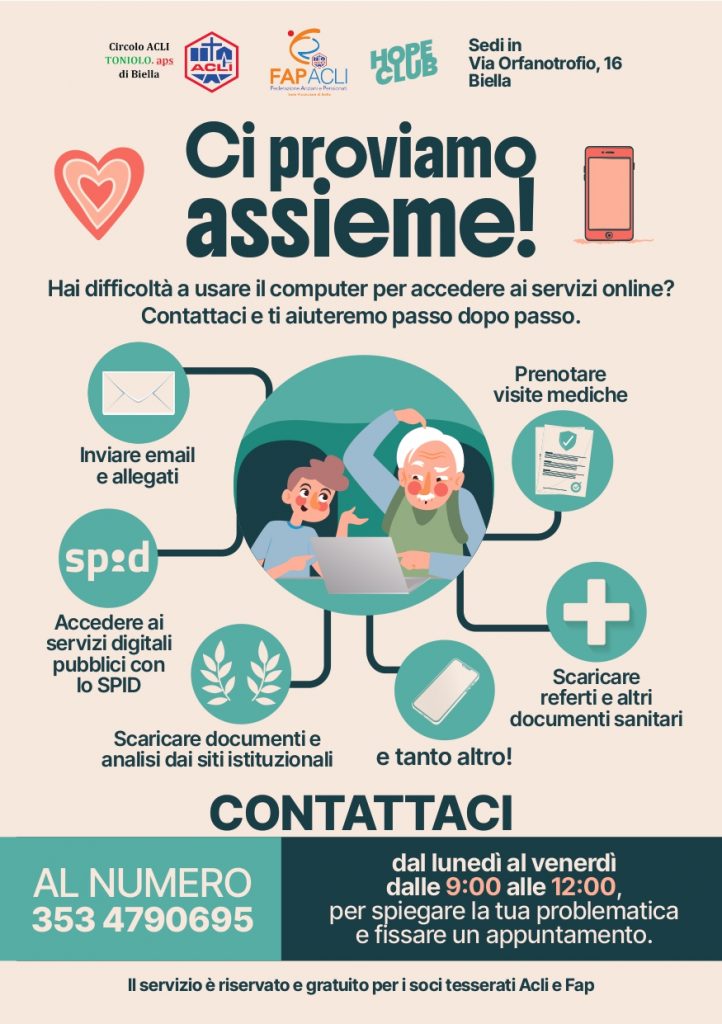 A partire dal 13 ottobre, a Biella, prenderà avvio “Ci proviamo assieme!“, una nuova iniziativa in collaborazione con Hope Club, riservata ai tesserati FAP e Acli, pensata per offrire supporto nell’utilizzo dello smartphone e del computer, e per facilitare l’accesso ai principali servizi digitali.