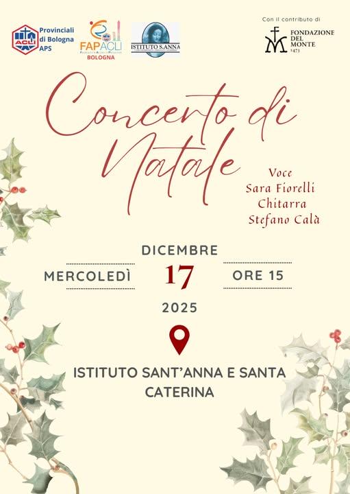 La Fap Acli di Bologna, insieme alle Acli di Bologna e grazie al contributo della Fondazione del Monte di Bologna e Ravenna, è tra i promotori del Concerto di Natale, organizzato dalla Fondazione Sant’Anna e Santa Caterina il prossimo 17 dicembre alle ore 15, presso la sede di via Pizzardi, a Bologna.