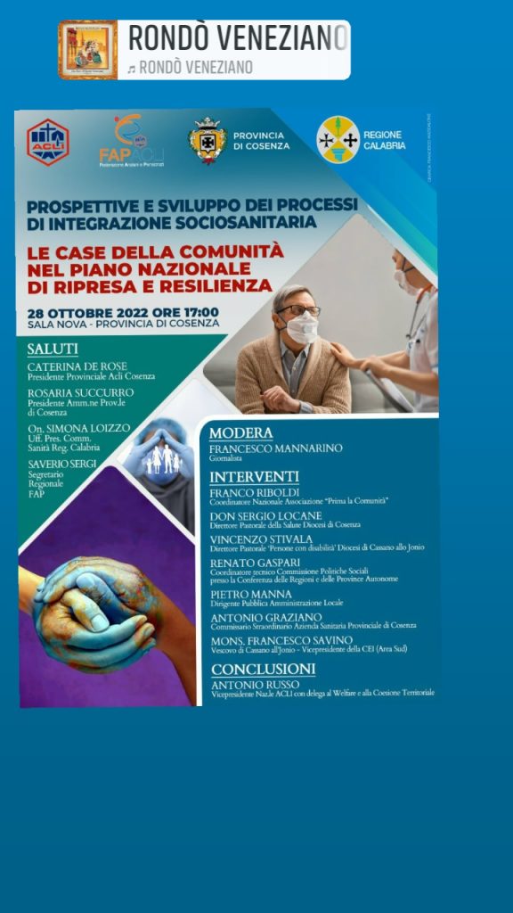 Il convegno, che verterà sulle prospettive e sugli sviluppi dei processi di integrazione socio-sanitaria, vedrà, tra gli altri, la partecipazione del Segretario Regionale Fap, Saverio Sergi. Porteranno i suoi saluti anche la Presidente delle Acli di Cosenza, Caterina De Rose, mentre le conclusioni saranno affidate al Vice Presidente Nazionale delle Acli, Antonio Russo.