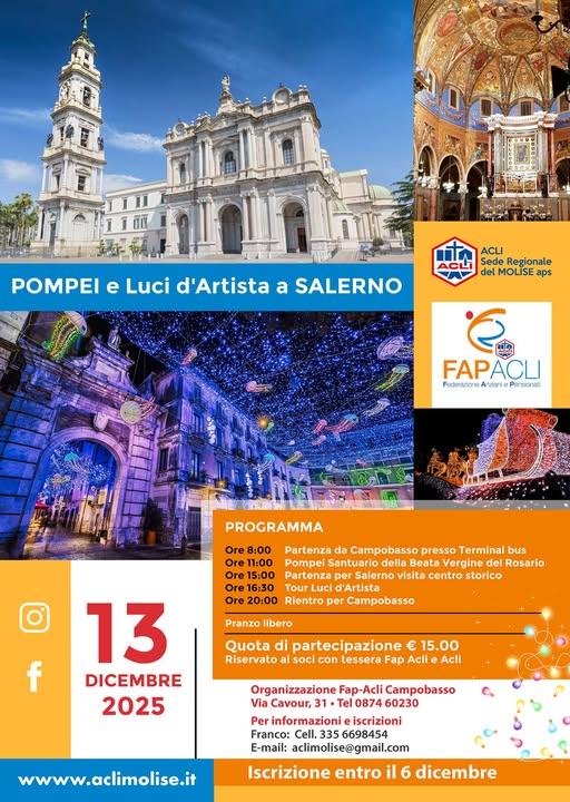La FAP ACLI Campobasso organizza per il 13 Dicembre 2025 un viaggio a POMPEI e Luci d’Artista a SALERNO.