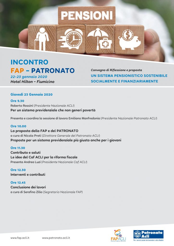 Si svolgerà i prossimi 22 e 23 gennaio, presso l’Hotel Hilton di Fiumicino (RM), l’incontro congiunto tra Fap ACLI e Patronato ACLI per sviluppare una serie di riflessioni focalizzate sui rapporti tra la Federazione Anziani e Pensionati e i servizi. Il convegno, dal titolo “Un sistema pensionistico sostenibile socialmente e finanziariamente” vedrà la partecipazione del Presidente nazionale delle ACLI, Roberto Rossini, del Presidente nazionale del Caf, Andrea Luzi, oltre ai vertici del Patronato Acli, – nelle figure del Presidente Emiliano Manfredonia, il Vice Presidente Martino Troncatti e il Direttore generale Nicola Preti – e della Fap – i Vice Segretari Giovanni Battista Armelloni e Rosario Cavallo.
