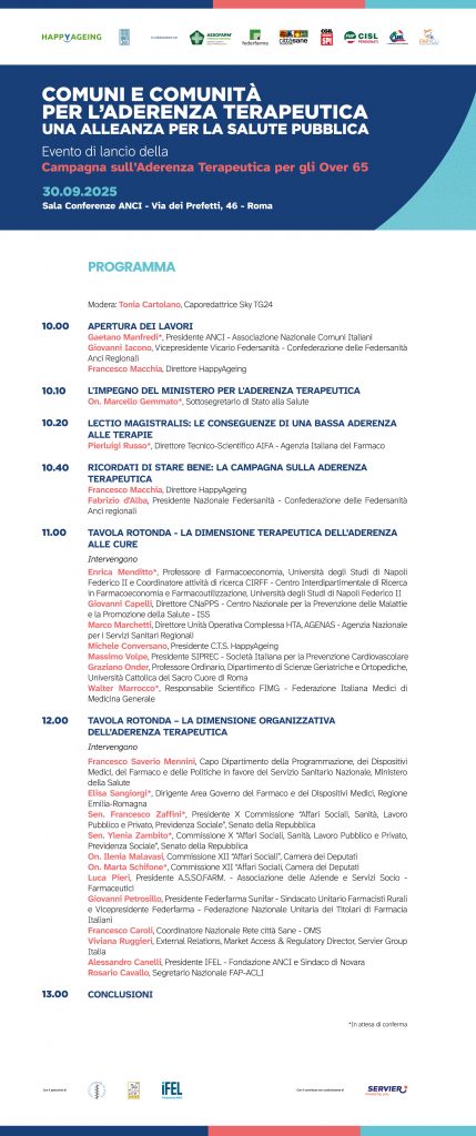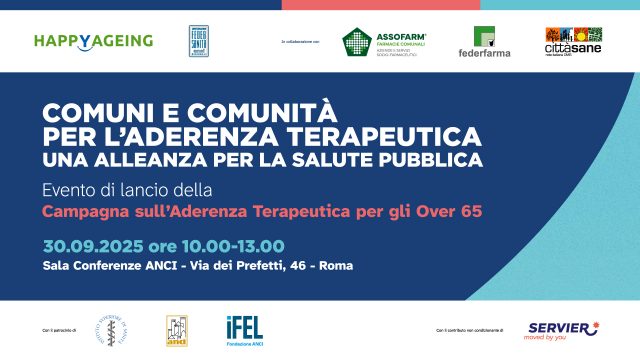 Si svolgerà il prossimo 30 settembre, presso la Sala Conferenza di ANCI a Roma, l’evento “Comuni e Comunità per l’aderenza terapeutica. Una Alleanza per la Salute Pubblica”, organizzato da HappyAgeing, l’Alleanza per l’Invecchiamento attivo di cui fa parte anche la Fap Acli, la quale interverrà in un apposito panel dedicato alla dimensione organizzativa dell’aderenza terapeutica.