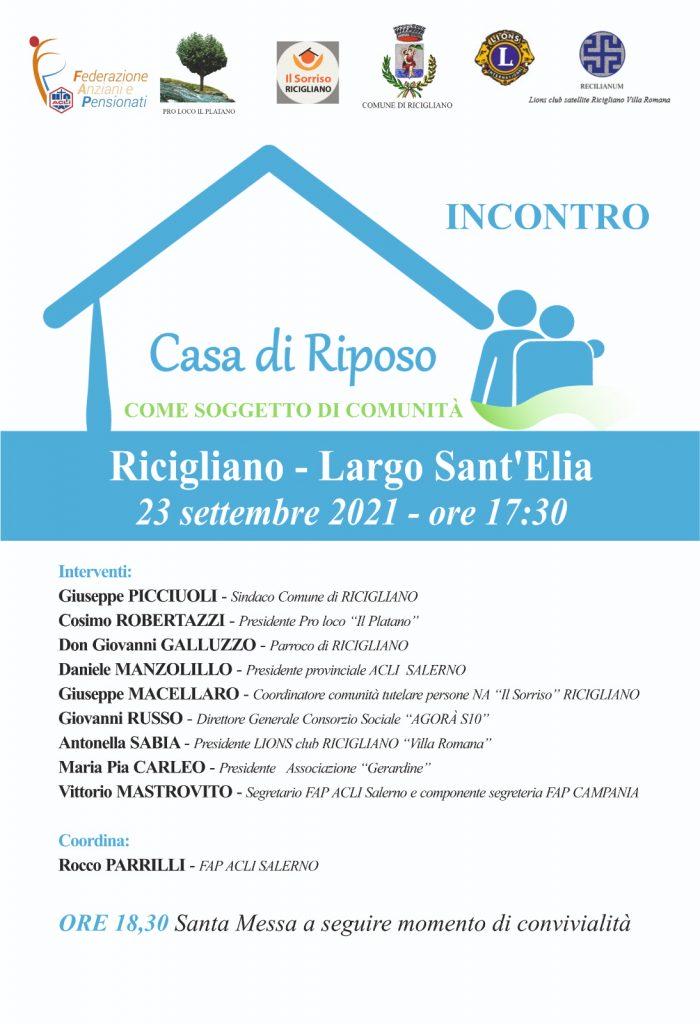 Promosso dalla FAP ACLI di Salerno, lo scorso 23 settembre, un convegno che apre a un progetto orientato a costruire una solida e strutturata forma di interazione tra associazionismo, enti pubblici (comune e consorzio sociale) e casa per anziani, sorta di recente in un comune del salernitano, Ricigliano, ubicato ai confini con la Basilicata. Nell’occasione sono state gettate le basi per la creazione di una sorta di convenzione tra i vari soggetti che hanno partecipato all’iniziativa per mettere a punto una serie di azioni coordinate e finalizzate a costruire un profilo di casa per anziani quale soggetto di comunità.
