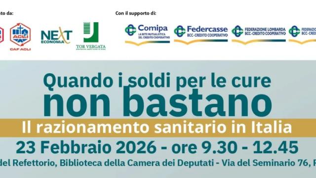 Si terrà lunedì 23 febbraio 2026, dalle ore 9.30 alle 12.45, presso la Sala del Refettorio della Biblioteca della Camera dei Deputati (Via del Seminario 76, Roma), la presentazione pubblica della ricerca “Quando i soldi per le cure non bastano. Il razionamento sanitario in Italia”, realizzata l’Università di Roma Tor Vergata con NeXt Nuova Economia per Tutti.