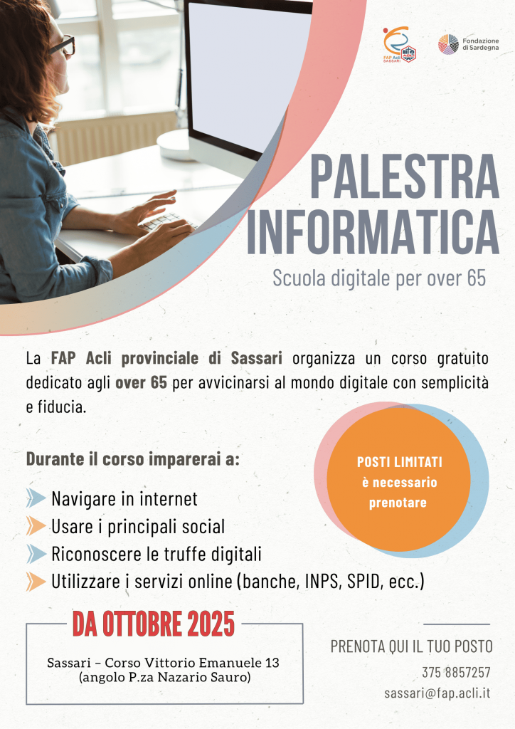 Il corso comincerà ad ottobre 2025 e si terrà in Corso Vittorio Emanuele 13 (SS). Per prenotarsi, chiamare il 3758857257 oppure scrivere a sassari@fap.acli.it