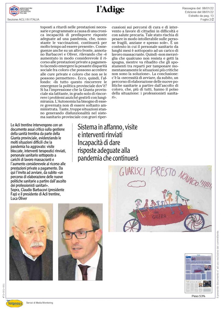 Di seguito l’articolo pubblicato lo scorso 8 gennaio sul giornale “L’Adige“, il quale ha raccolto il grido di allarme di Luca Oliver, Presidente Provinciale ACLI Trento, e Claudio Barbacovi, Segretario Provinciale Fap. I due dirigenti aclisti, infatti, a due anni dall’avvento della pandemia, si chiedono come sia possibile che il sistema sanitario continui ad essere in affanno.