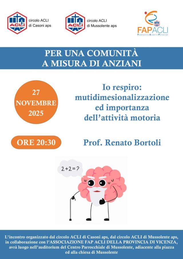 Il circolo ACLI di Casoni aps e il circolo ACLI di Mussolente aps, in collaborazione con la FAP ACLI di Vicenza, organizzano per giovedì 27 novembre 2025, alle 20.30 nell’auditorium del Centro Parrocchiale di Mussolente, adiacente alla piazza ed alla chiesa di Mussolente, l’incontro pubblico sul tema “Io respiro: mutidimesionalizzazione ed importanza dell’attività motoria”, a cura del prof. Renato Bortoli.
